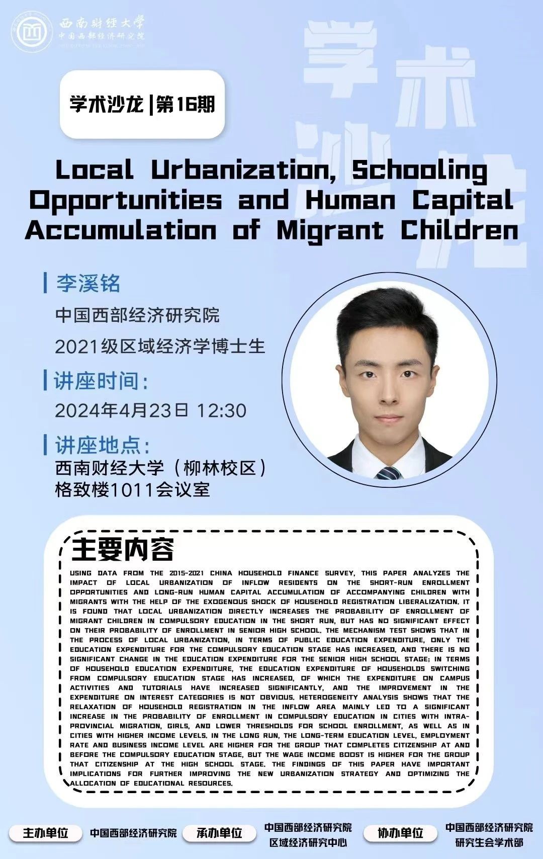 Using data from the 2015-2021 China Household Finance Survey, this paper analyzes the impact of local urbanization of inflow residents on the short-run enrollment opportunities and long-run human capital accumulation of accompanying children with migrants with the help of the exogenous shock of household registration liberalization. It is found that local urbanization directly increases the probability of enrollment of migrant children in compulsory education in the short run, but has no significant effect on their probability of enrollment in senior high school. The mechanism test shows that in the process of local urbanization, in terms of public education expenditure, only the education expenditure for the compulsory education stage has increased, and there is no significant change in the education expenditure for the senior high school stage; in terms of household education expenditure, the education expenditure of households switching from compulsory education stage has increased, of which the expenditure on campus activities and tutorials have increased significantly, and the improvement in the expenditure on interest categories is not obvious. Heterogeneity analysis shows that the relaxation of household registration in the inflow area mainly led to a significant increase in the probability of enrollment in compulsory education in cities with intra-provincial migration, girls, and lower thresholds for school enrollment, as well as in cities with higher income levels. In the long run, the long-term education level, employment rate and business income level are higher for the group that completes citizenship at and before the compulsory education stage, but the wage income boost is higher for the group that citizenship at the high school stage. The findings of this paper have important implications for further improving the new urbanization strategy and optimizing the allocation of educational resources.