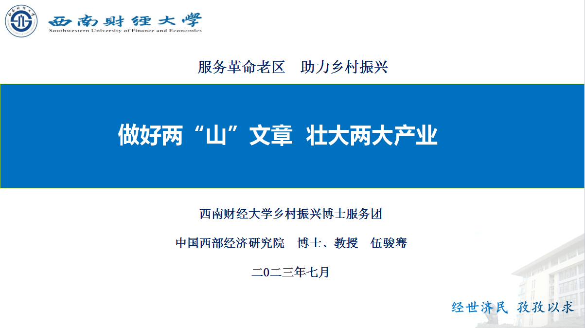 伍骏骞博士在分析了浙江“千万工程”典型案例及经验启示的基础上,建议通江做好“山”的文章,抓好通江“璧山”和“空山”两座名山,写好通江的两山论。一是把握区位特色,打造都市中的制高点,形成都市中的观景台;二是提升生态涵养,优化城市形象“理山”,发挥重要的生态涵养作用;三是改善生活状态,营造依山傍水的康养生活;四是加强文化传承,建设红色文化高地。他还建议通江抓好“一红一白”两大产业,即银耳产业、银发产业、银领回雁与红色旅游、红色培训、红色研学。